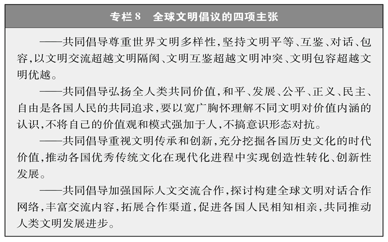 ——中国提出全球文明倡议,共同倡导尊重世界文明多样性,共同倡导弘扬全人类共同价值,共同倡导重视文明传承和创新,共同倡导加强国际人文交流合作。全球文明倡议向全世界发出增进文明交流对话、在包容互鉴中促进人类文明进步的真挚呼吁,为推动构建人类命运共同体注入了精神动力。